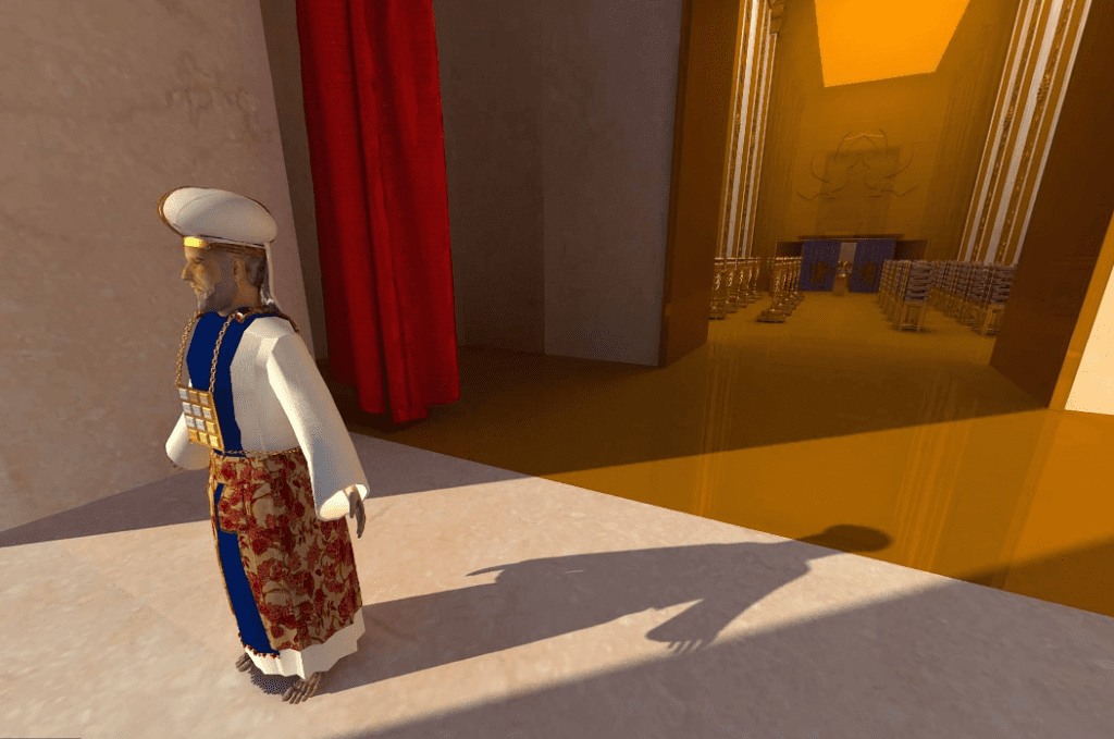It is interesting to note that the image does not permit the viewer to enter the Holy of Holies, which was restricted to all save the High Priest on Yom Kippur. The same location allows the viewer to navigate outside the sanctuary. A priest in his distinctive garments stands next to the altar, ready to perform the service.