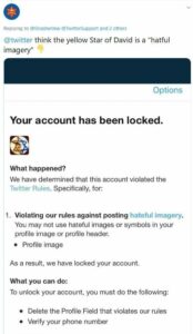 Twitter instructed them that if they delete the “hateful imagery”, i.e. the Star of David, the account may be unlocked. Twitter’s “Hateful Imagery” policy states: