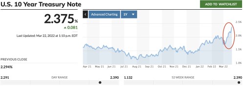 Compare that to all the incremental moves over the past year when the Fed had the meter shunted, as I say, and you see bond yields have come alive and are changing to show inflation at a rate of rise we haven’t seen in a long time. The 10YR bond/note has gone from 1.95% on March 9, when the Fed ended tapering with its final QE purchase, to 2.39% today — 46 basis points in less than two weeks, and in the last two days alone it rose 24 of those basis points.