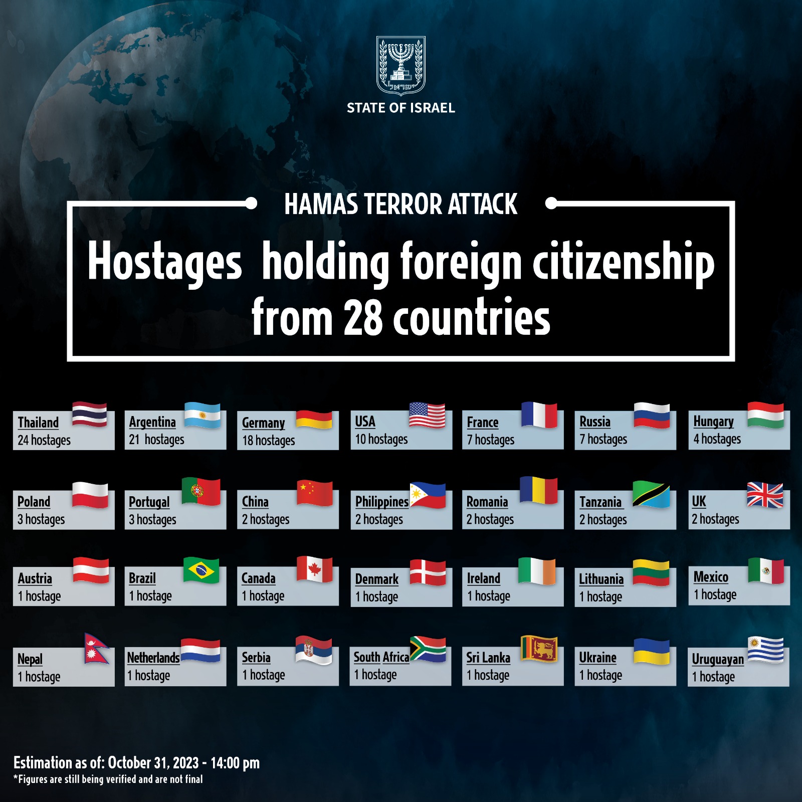 They kidnapped hostages from babies and young children to the elderly, having been offered a bounty of $10,000 for each of the Islamic terrorists who slaughtered so many, imprisoning as many as possible to hold over the heads of Israel. But the hostages, just like the victims of the October 7 slaughter, are not just Israeli. Some are dual citizens and some are foreign workers. There are hostages from 28 nations.