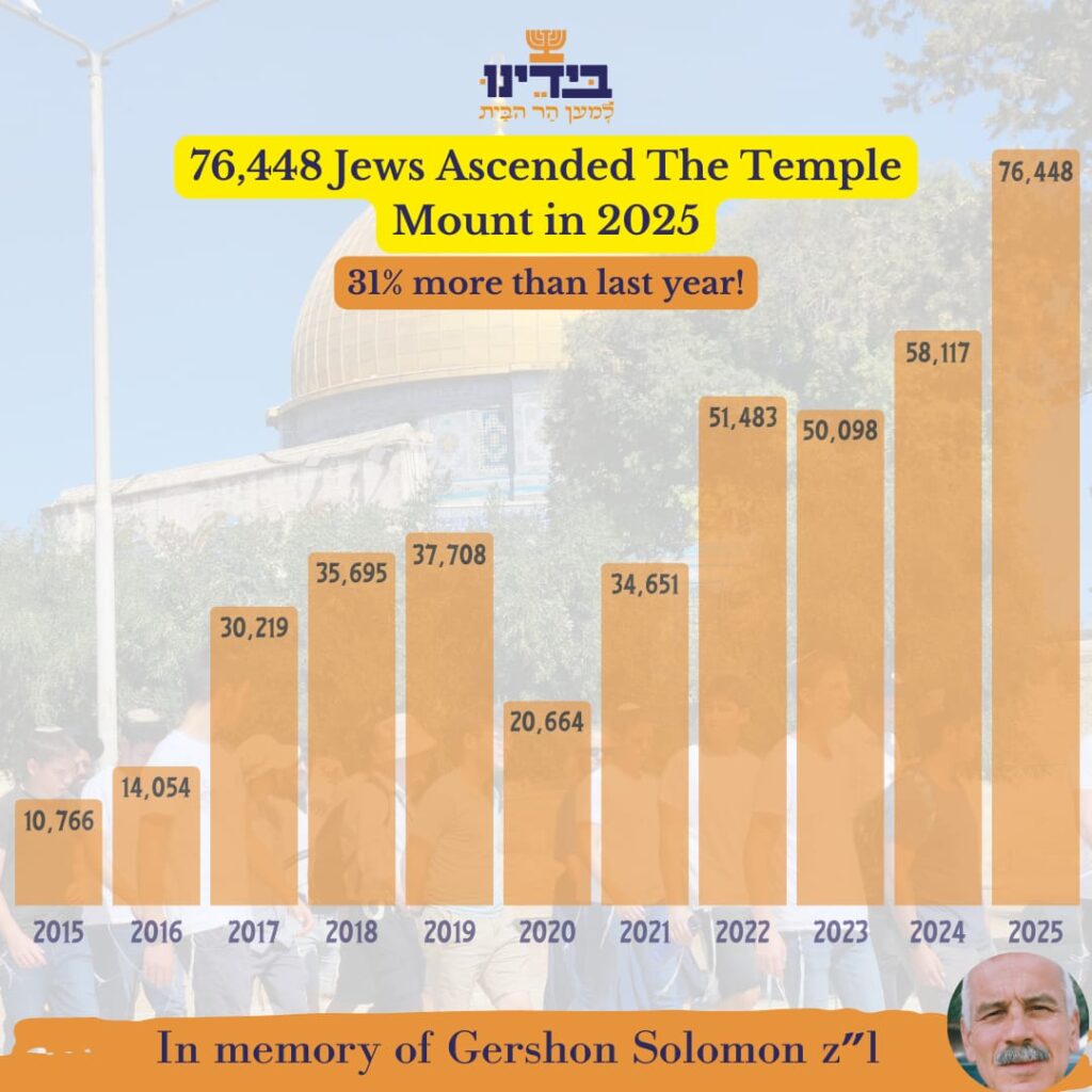 In 2025, 76,448 Jews ascended to the Temple Mount—Judaism’s holiest site—shattering all previous records. This represents a 31% increase over 2024 and marks the continuation of a decade-long surge that has seen Jewish presence at the site more than sevenfold since 2015, when only 10,700 Jews made the ascent.