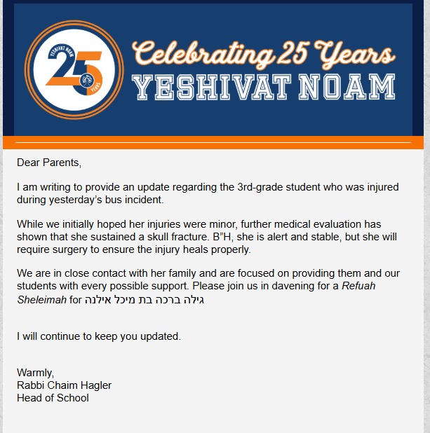 As the investigation continues, the Jewish community and people of conscience are left confronting the stark reality of how fragile safety can be, even far from Israel, even on an ordinary school day. The public is asked to pray for the complete recovery of Gila Bracha bat Michal Ilana, that the surgery be successful, that her healing be swift and whole, and that those responsible for this act be brought to justice without delay.